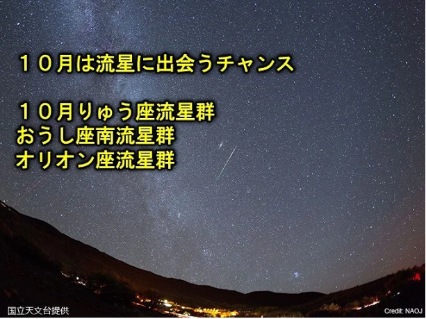 10月は「オリオン座流星群」と「10月りゅう座流星群」が見頃を迎えます。また、満月は今年最も大きな「スーパームーン」です。