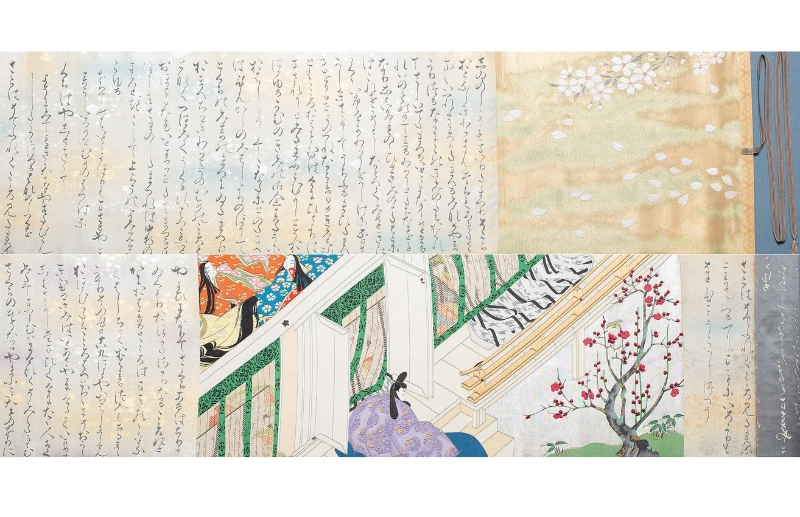 まず『伊太郎源氏』。西陣織の織屋・紫紘の創業者である山口伊太郎氏が70歳で挑んだ、織物による『源氏物語絵巻』である。全4巻が完成したのは、30余年を経た「源氏物語千年紀」に当たる2008年。伊太郎氏はその前年に最終巻全ての指示を終え、完成を待つばかりとなった矢先、105歳で永眠したという。「美術館で国宝の『隆能源氏』を見たのがきっかけだと聞いています。