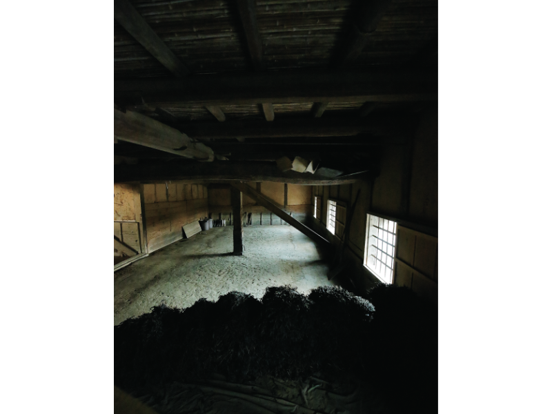 聞けば、生葉のまま裁断すると藍の色素インジコが出てしまうという。武知さんは、藍を乾燥させてから2~3cmに切り刻み、葉と茎に分けるという手順をずっと守っている。そして、寝床と呼ばれる作業場に、収穫時期の異なる1番葉と2番葉に分けて積み上げておく。