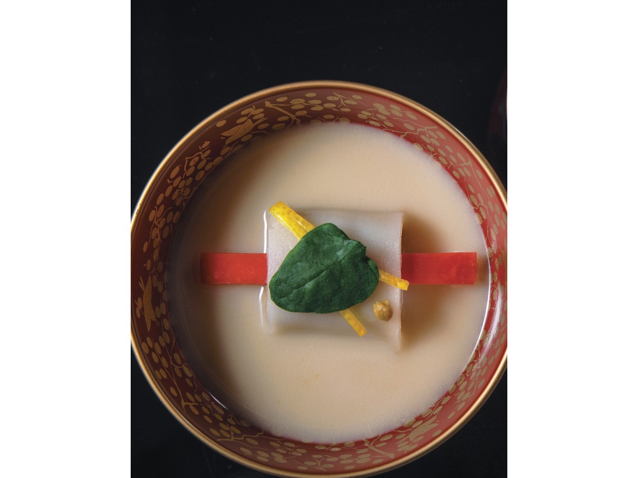 先附(さきづけ)は「招福」。邪気払いの小豆粥(がゆ)は、白菜の白と緑で描く雪解けの景色を彩りに、昆布締めの信州サーモン、あわび茸(たけ)の手綱に文旦の爽やかな香りで春の訪れを表現する。続くお椀は「福鹿寿(ふくろくじゅ)」。大和芋でふんわり仕上げた鹿肉の真丈を花びら餅にし、海老芋と合わせた白味噌にはほのかな柚子の香り。温物「寒牡丹」は、この時期、一番うまみを増す猪肉を、シンプルな塩すきで楽しませる趣向だ。クレソンやセリなど、山と水が育む香味が、力強い味の素晴らしきわき役になる。